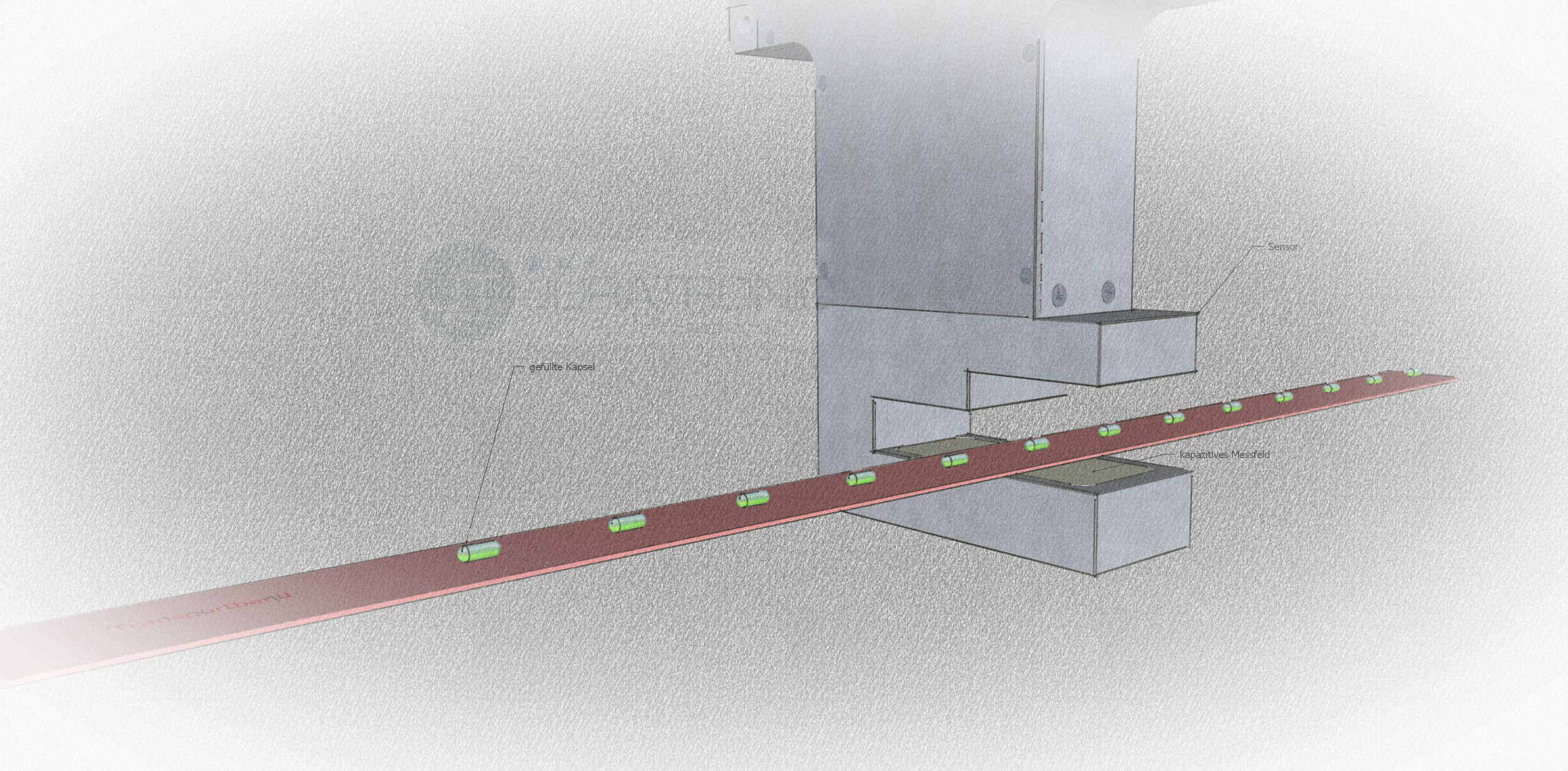 Die Kapsel kann aber auch auf einem Transportband liegen und durch das Messfeld eines kapazitiven Sensors gefahren werden: