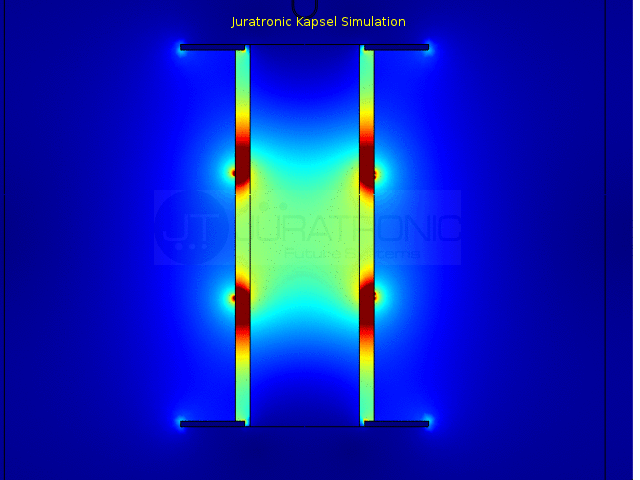 Man kann sehr gut erkennen, wie homogen die Verteilung des elektrischen Feldes im Inhalt der Kapsel ist.